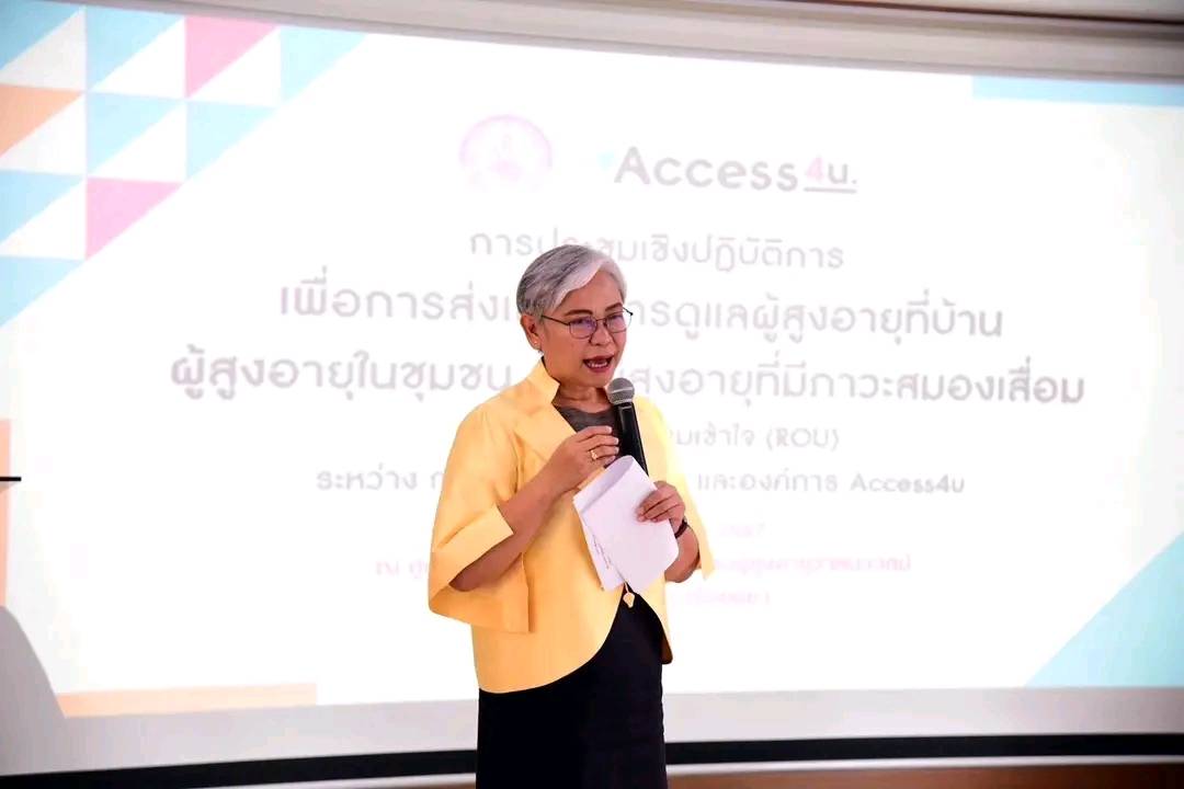 ศพส.บ้านบุรีรัมย์ เข้าร่วมประชุมเชิงปฏิบัติการเพื่อการส่งเสริมการดูแลผู้สูงอายุที่บ้าน ผู้สูงอายุในชุมชน และผู้สูงอายุที่มีภาวะสมองเสื่อม ภายใต้บันทึกความเข้าใจ (ROU) ระหว่างกรมกิจการผู้สูงอายุ และองค์การ Access4u มลรัฐออสเตรเลียใต้ ระหว่างวันที่ 25 - 28 มิถุนายน 2567 โดยมีอธิบดีกรมกิจการผู้สูงอายุ (นางสาวแรมรุ้ง วรวัธ) เป็นประธานการประชุม ฯ Ms. Catherine Miller ประธานกรรมการบริหารองค์การ Access4u และคณะ คณะผู้บริหารกรมกิจการผู้สูงอายุ และเจ้าหน้าที่ในสังกัดกรมกิจการผู้สูงอายุเข้าร่วม ณ ศูนย์พัฒนาการจัดสวัสดิการสังคมผู้สูงอายุวาสนะเวศม์ จังหวัดพระนครศรีอยุธยา