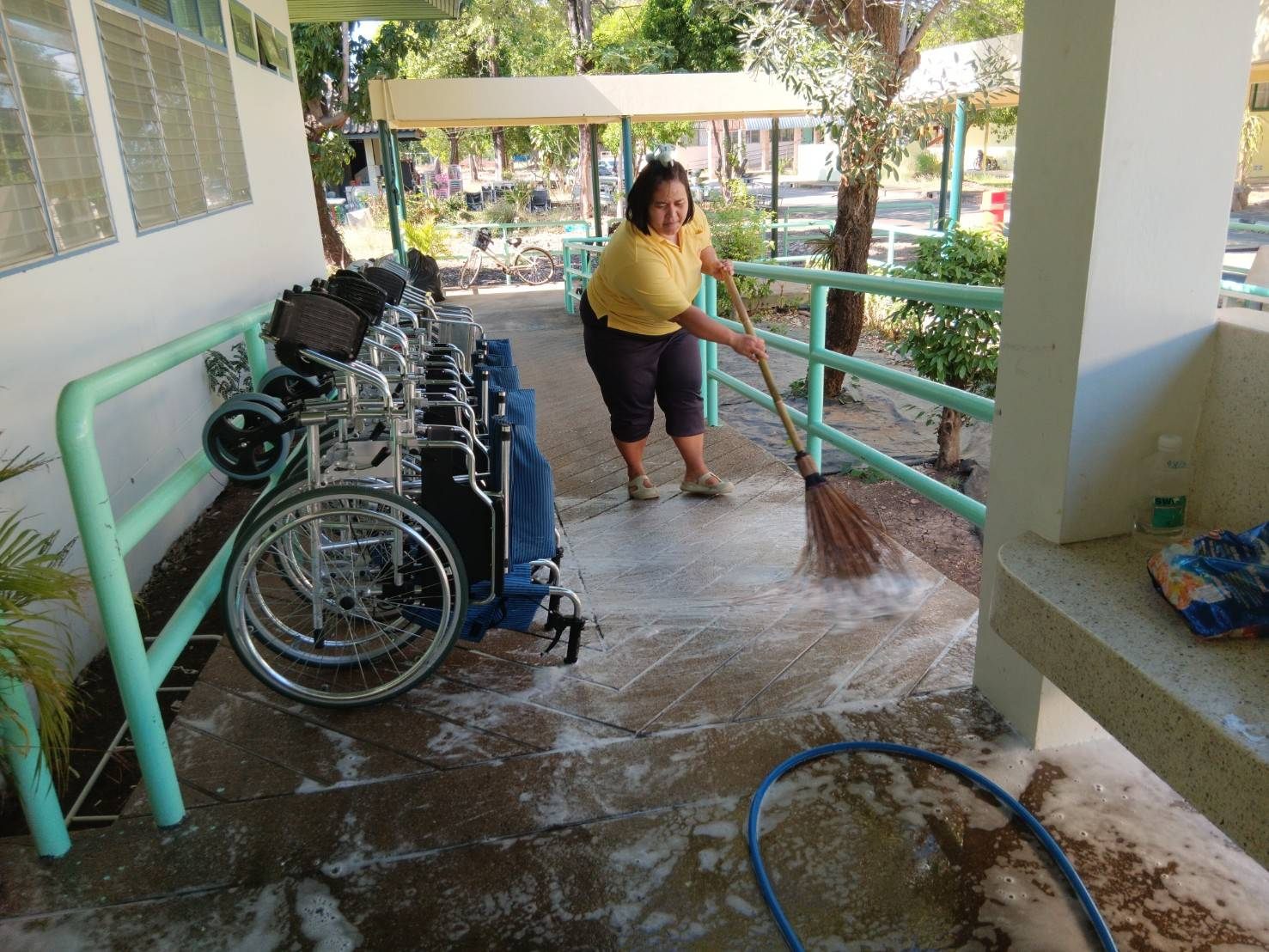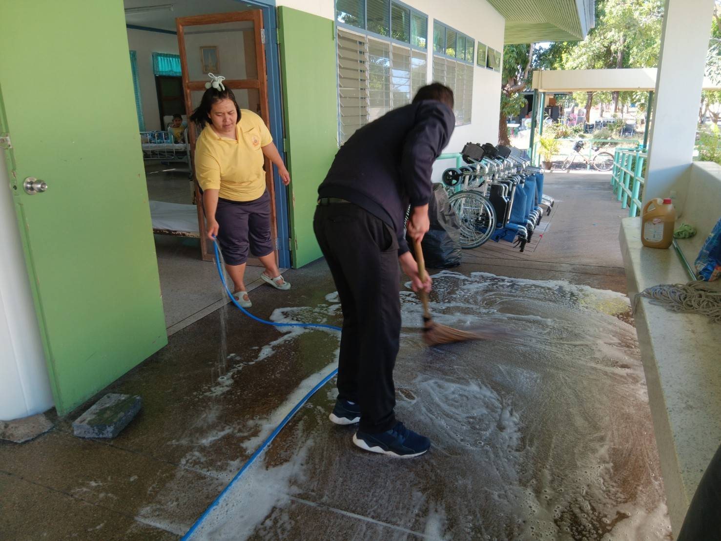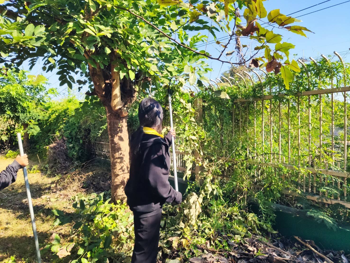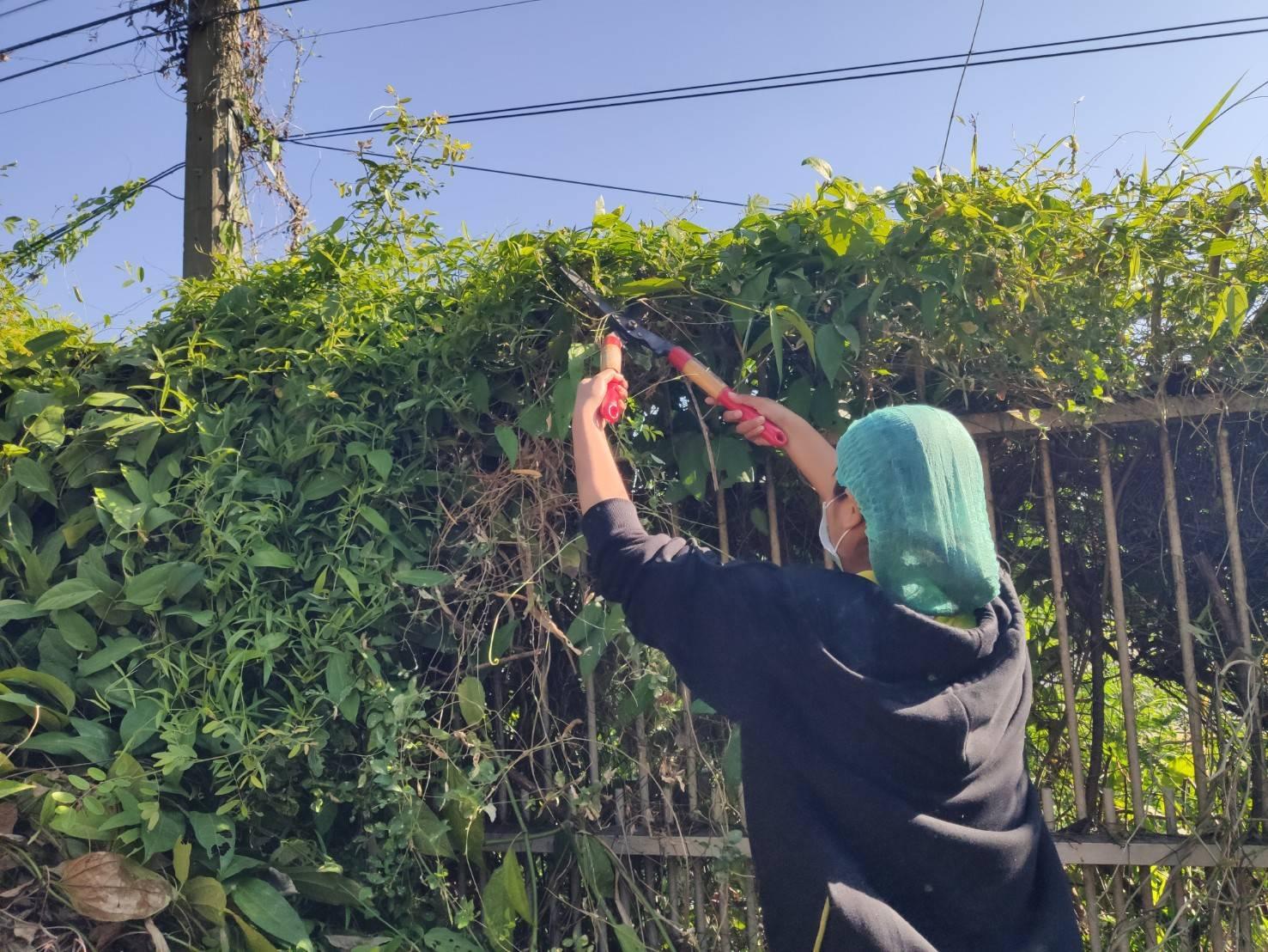 5 ส. ร่วมใจ พัฒนาสภาพแวดล้อม ตัดกิ่งไม้บริเวณรั้วด้านหน้าศูนย์ฯ ทำความสะอาดบริเวณเรือนนอน
