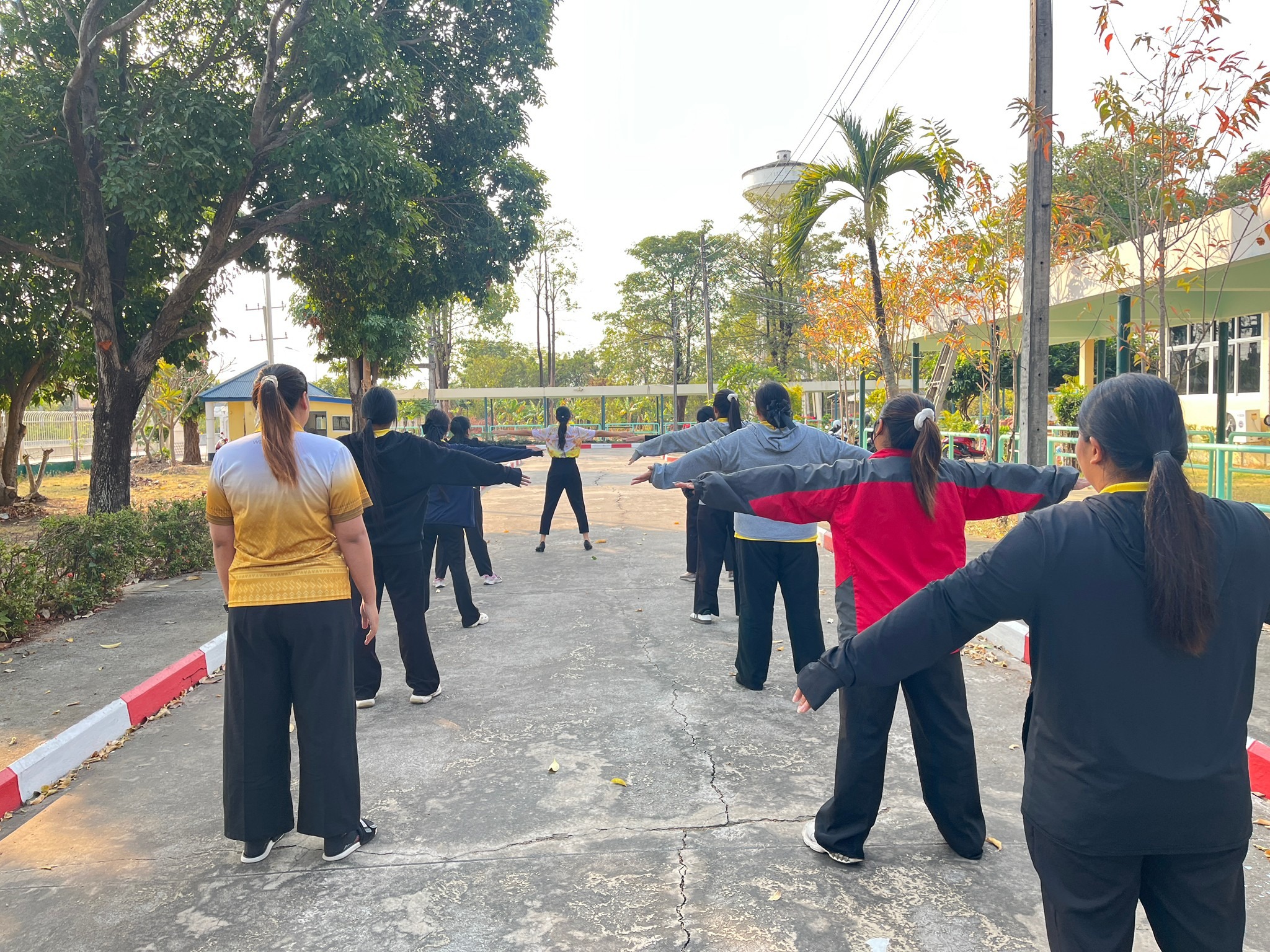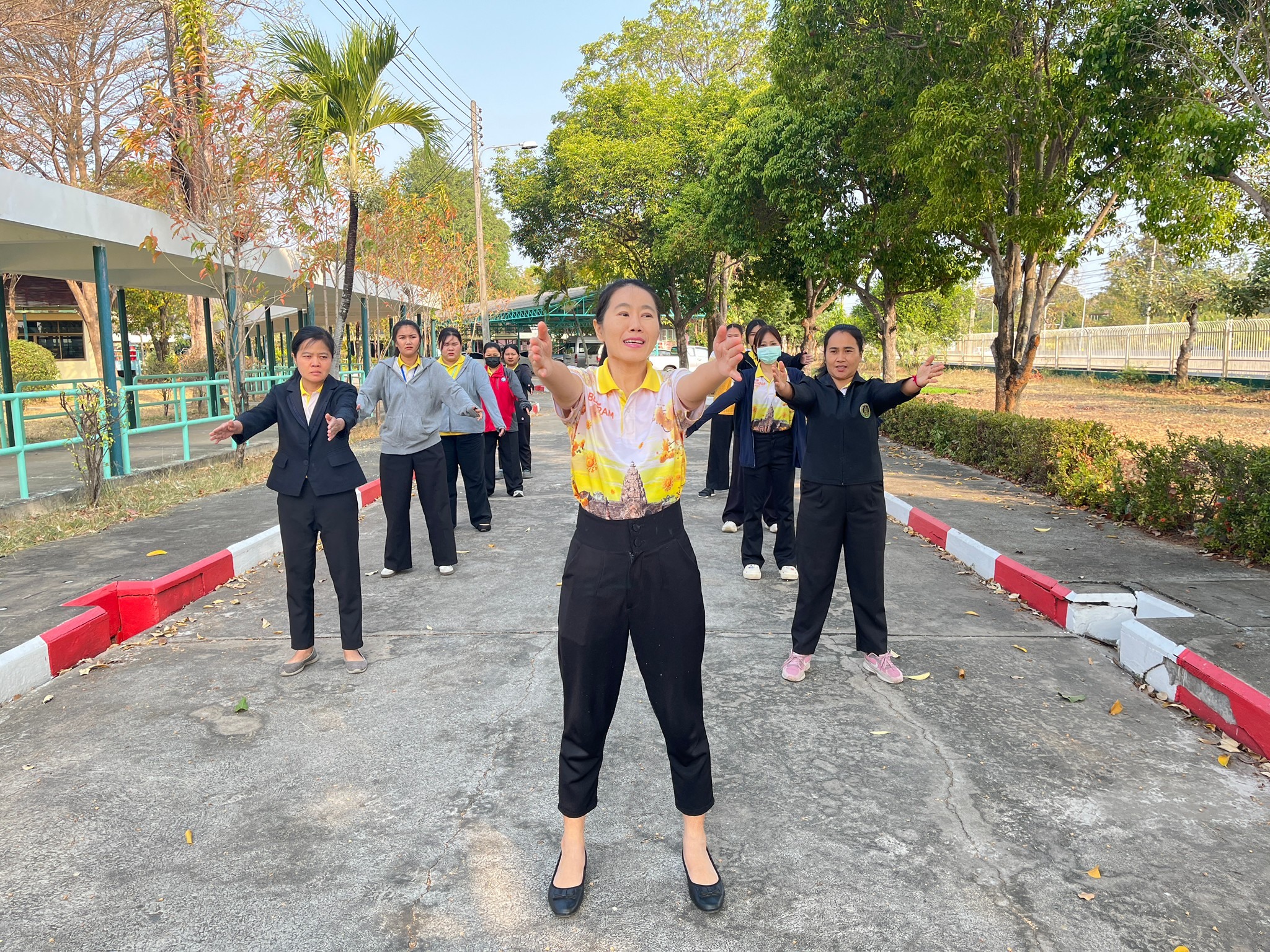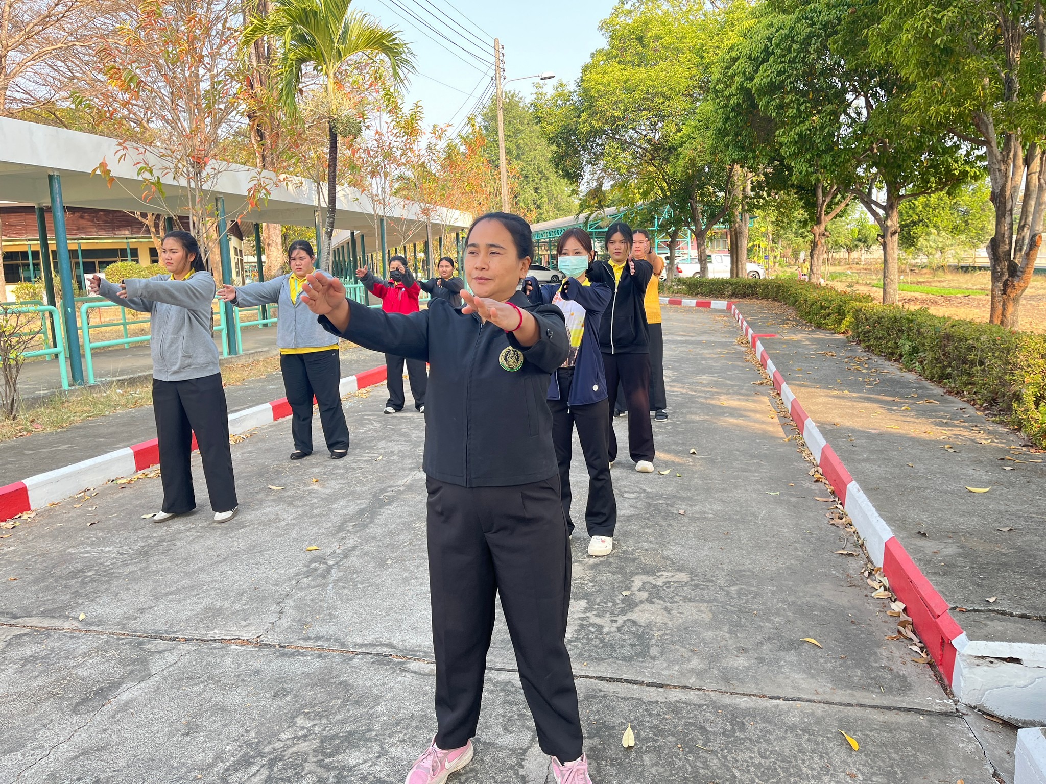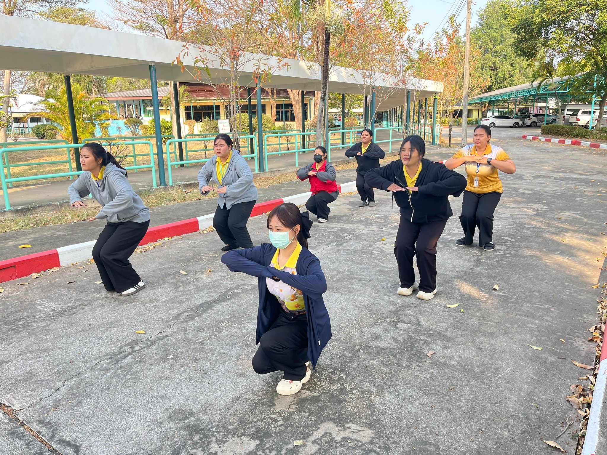 กิจกรรม ออกกำลังกายเป็นนิจ ชีวิตเป็นสุข สุขภาพแข็งแรงโดยเจ้าหน้าที่ออกกำลังกาย ยืดเหยียดกล้ามเนื้อ ก่อนปฏิบัติงาน