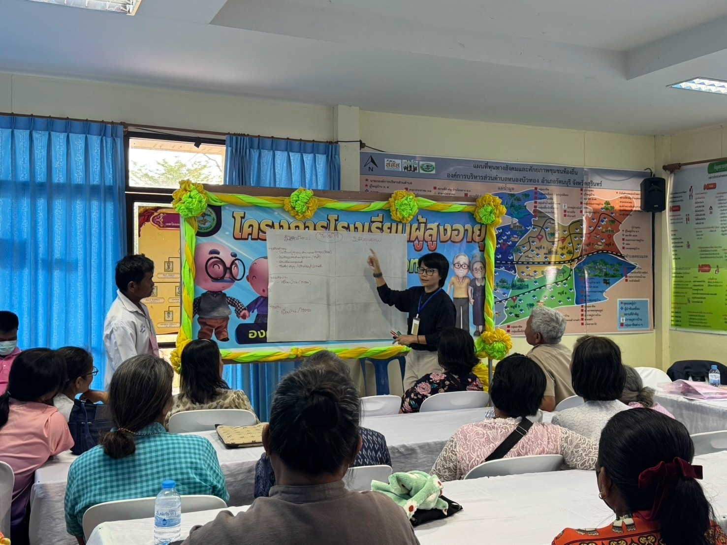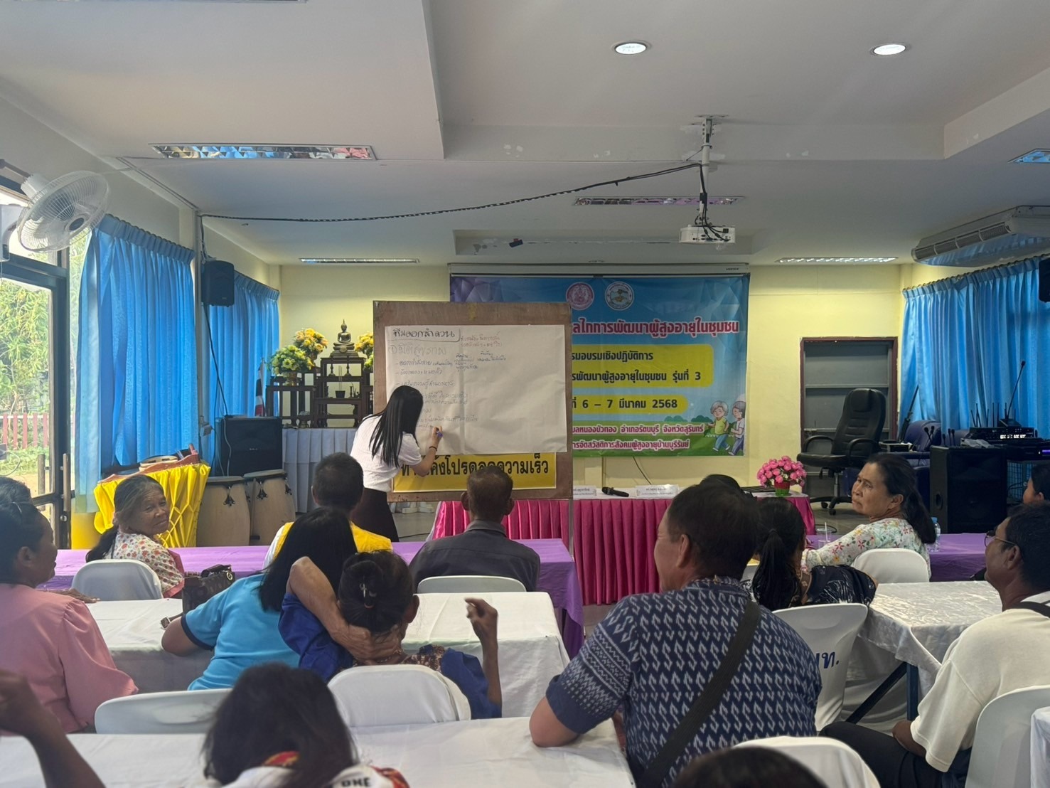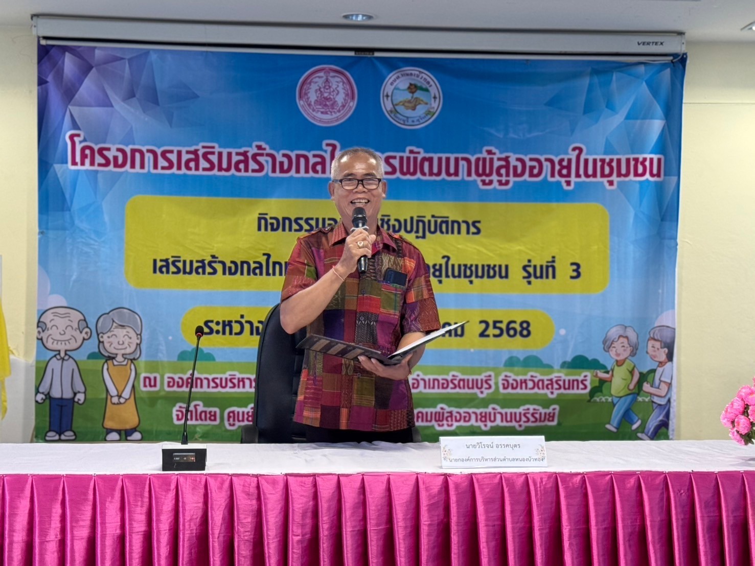 ศพส.บ้านบุรีรัมย์ โดยกลุ่มนโยบายและวิชาการ จัดโครงการเสริมสร้างกลไกการพัฒนาผู้สูงอายุในชุมชน กิจกรรม อบรมเชิงปฏิบัติการเสริมสร้างกลไกการพัฒนาผู้สูงอายุในชุมชน รุ่นที่ 3 กลุ่มเป้าหมาย จำนวน 50 คน ณ องค์การบริหารส่วนตำบลหนองบัวทอง อำเภอรัตนบุรี จังหวัดสุรินทร์ โดยมี นายวิโรจน์ อรรคบุตร นายกองค์การบริหารส่วนตำบลหนองบัวทอง เป็นประธาน