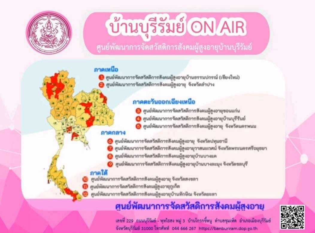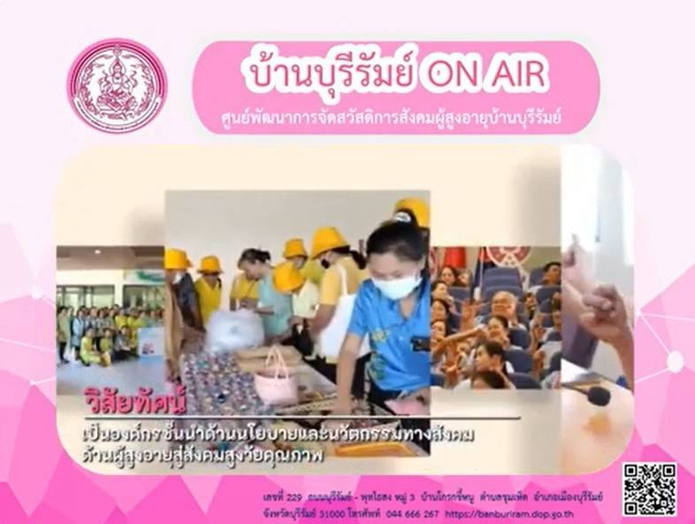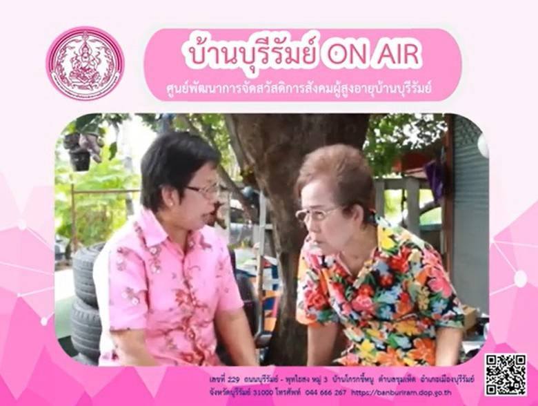 ศพส.บ้านบุรีรัมย์ จัดรายการ "บ้านบุรีรัมย์ ON AIR" โดยให้ความรู้ เรื่อง แนะนำภารกิจกรมกิจการผู้สูงอายุ และรู้เท่าทันการหลอกลงทุน ประชาสัมพันธ์โครงการ ประดิดประดอย ส่งเสริมอาชีพ การมีงานทำ สร้างรายได้สูงอายุ และร้านฝากขาย บ้านบุรีรัมย์บูติกผ่านทาง Facebook Live ศูนย์พัฒนาการจัดสวัสดิการสังคมผู้สูงอายุบ้านบุรีรัมย์