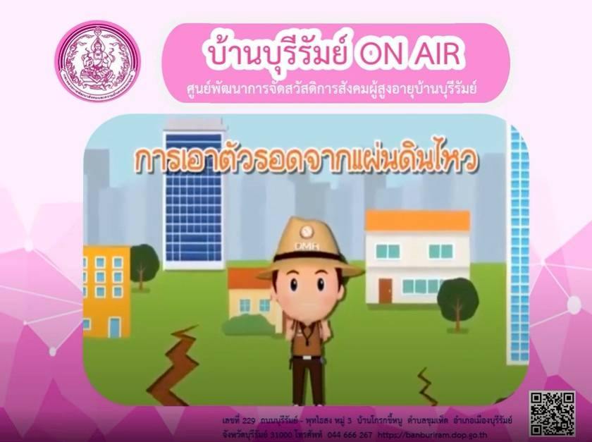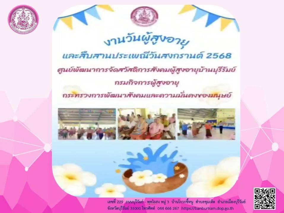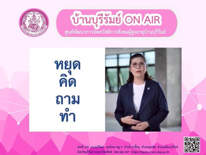 ศพส.บ้านบุรีรัมย์ จัดรายการ "บ้านบุรีรัมย์ ON AIR" โดยให้ความรู้ เรื่อง ภาพบรรยากาศงานพิธีรดน้ำดำผู้สูงอายุ ศพส.บ้านบุรีรัมย์ การเตรียมพร้อมรับมือเมื่อเกิดแผ่นดินไหว และผู้สูงอายุรู้เท่าทันภัยออนไลน์ " หยุด คิด ถาม ทำ" ประชาสัมพันธ์โครงการ ประดิดประดอย ส่งเสริมอาชีพการมีงานทำ สร้างรายได้สูงอายุ และร้านฝากขาย บ้านบุรีรัมย์บูติกผ่านทาง Facebook Live ศูนย์พัฒนาการจัดสวัสดิการสังคมผู้สูงอายุบ้านบุรีรัมย์