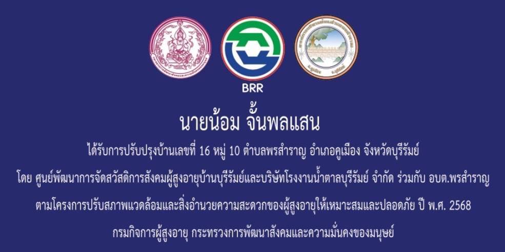 นางเจริญศรี วงค์สม ผู้อำนวยการศูนย์พัฒนาการจัดสวัสดิการสังคมผู้สูงอายุบ้านบุรีรัมย์ และนางสาวแพรวนภา ลุนผา ช่วยปฏิบัติงานด้านพัฒนาสังคม พร้อมด้วยผู้บริหารและเจ้าหน้าที่องค์การบริหารส่วนตำบลพรสำราญ ผู้แทนบริษัท โรงงานน้ำตาลบุรีรัมย์ จำกัด และผู้นำชุมชน ลงพื้นที่มอบบ้านให้ นายน้อม จั้นพลแสน บ้านเลขที่ 16 หมู่ที่ 10 ตำบลพรสำราญ อำเภอคูเมือง จังหวัดบุรีรัมย์ ตามโครงการปรับสภาพแวดล้อมและสิ่งอำนวยความสะดวกของผู้สูงอายุให้เหมาะสมและปลอดภัย ประจำปี พ.ศ. 2568 โดยใช้งบประมาณในการดำเนินการ จำนวน 40,000 บาท จากเงินนอกงบประมาณซึ่งบริจาคโดย บริษัท โรงงานน้ำตาลบุรีรัมย์ จำกัด