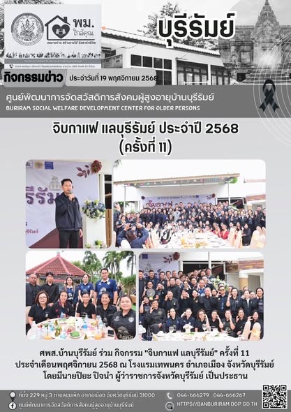 19 พ.ย. 2568 326ศพส.บ้านบุรีรัมย์ ร่วม กิจกรรม "จิบกาแฟ แลบุรีรัมย์" ครั้งที่ 11 ประจำเดือนพฤศจิกายน 2568 ณ โรงแรมเทพนคร อำเภอเมือง จังหวัดบุรีรัมย์ โดยมีนายปิยะ ปิจนำ ผู้ว่าราชการจังหวัดบุรีรัมย์ เป็นประธาน