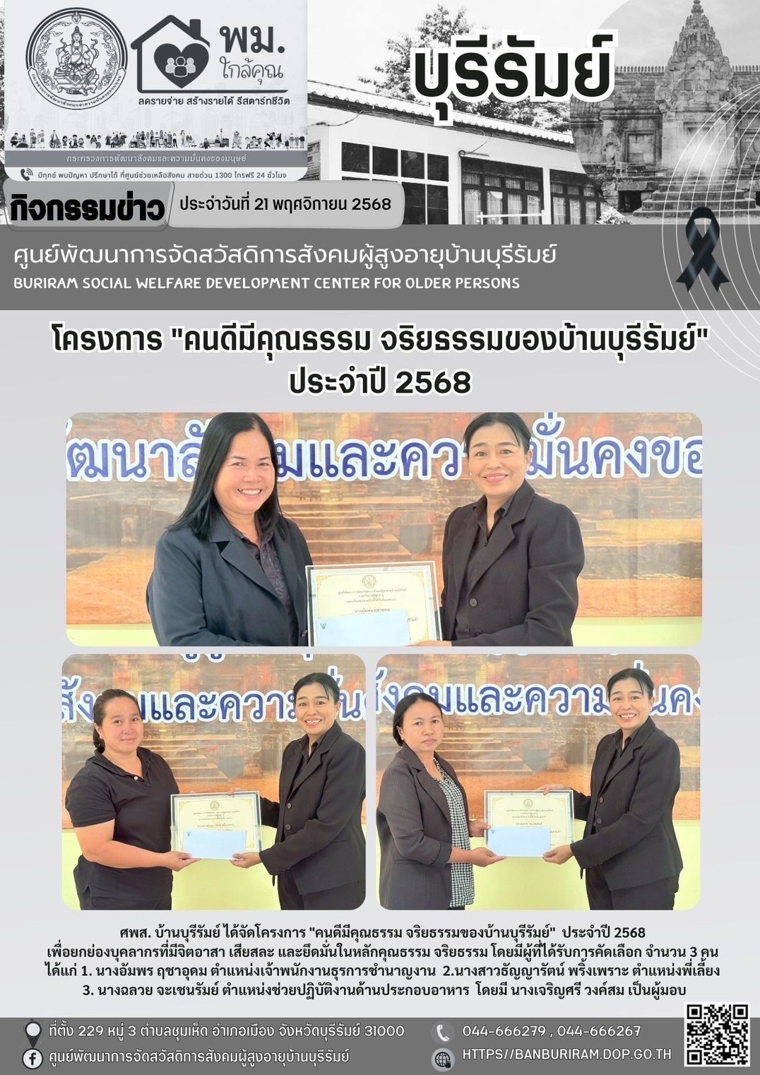21 พ.ย. 2568 182ศพส.บ้านบุรีรัมย์ จัดโครงการ "คนดีมีคุณธรรม จริยธรรมของบ้านบุรีรัมย์" ประจำปี 2568 โดยมีผู้ได้รับรางวัล ได้แก่ 1. นางอัมพร ฤชาอุดม ตำแหน่งเจ้าพนักงานธุรการชำนาญงาน 2. นางสาวธัญญารัตน์ พริ้งเพราะ ตำแหน่งพี่เลี้ยง 3. นางฉลวย จะเชนรัมยื ตำแหน่งช่วยปฏิบัติงานด้านประกอบอาหาร โดยมี น