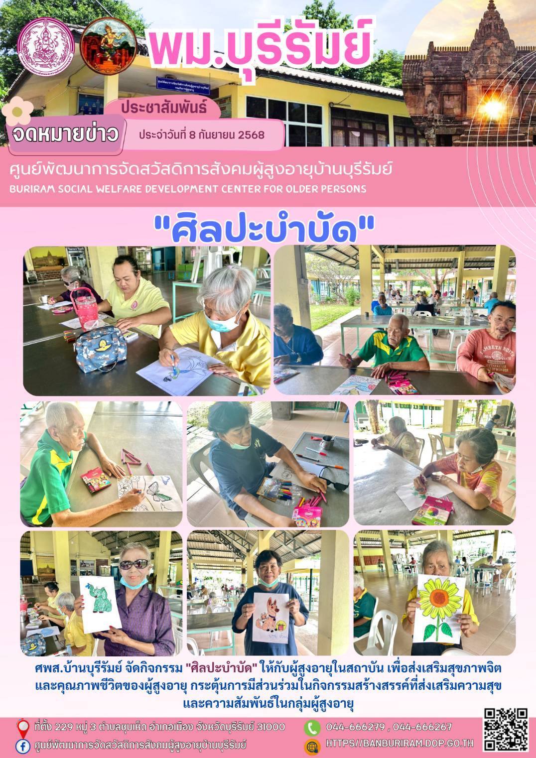 8 ก.ย. 2568 49ศพส.บ้านบุรีรัมย์ จัดกิจกรรม "ศิลปะบำบัด" ให้กับผู้สูงอายุในสถาบัน เพื่อส่งเสริมสุขภาพจิต และคุณภาพชีวิตของผู้สูงอายุ กระตุ้นการมีส่วนร่วมในกิจกรรมสร้างสรรค์ที่ส่งเสริมความสุข และความสัมพันธ์ในกลุ่มผู้สูงอายุ