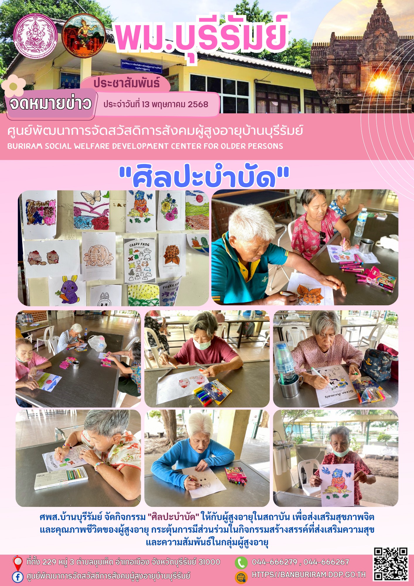 10 มิ.ย. 2568 108ศพส.บ้านบุรีรัมย์ จัดกิจกรรม "ศิลปะบำบัด" ให้กับผู้สูงอายุในสถาบัน เพื่อส่งเสริมสุขภาพจิตและคุณภาพชีวิตของผู้สูงอายุ กระตุ้นการมีส่วนร่วมในกิจกรรมสร้างสรรค์ที่ส่งเสริมความสุขและความสัมพันธ์ในกลุ่มผู้สูงอายุ