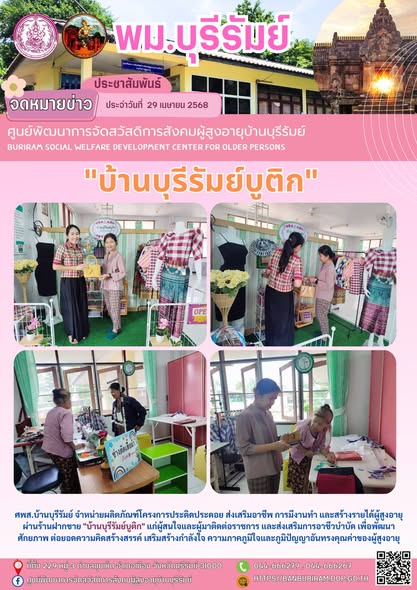 29 เม.ย. 2568 284ศพส.บ้านบุรีรัมย์ จำหน่ายผลิตภัณฑ์โครงการประดิดประดอย ส่งเสริมอาชีพ การมีงานทำ และสร้างรายได้ผู้สูงอายุ ผ่านร้านฝากขาย "บ้านบุรีรัมย์บูติก" แก่ผู้สนใจและผู้มาติดต่อราชการ และส่งเสริมการอาชีวบำบัด เพื่อพัฒนาศักยภาพ ต่อยอดความคิดสร้างสรรค์ เสริมสร้างกำลังใจ ความภาคภูมิใจและภูมิปัญญาอันทรงคุณ