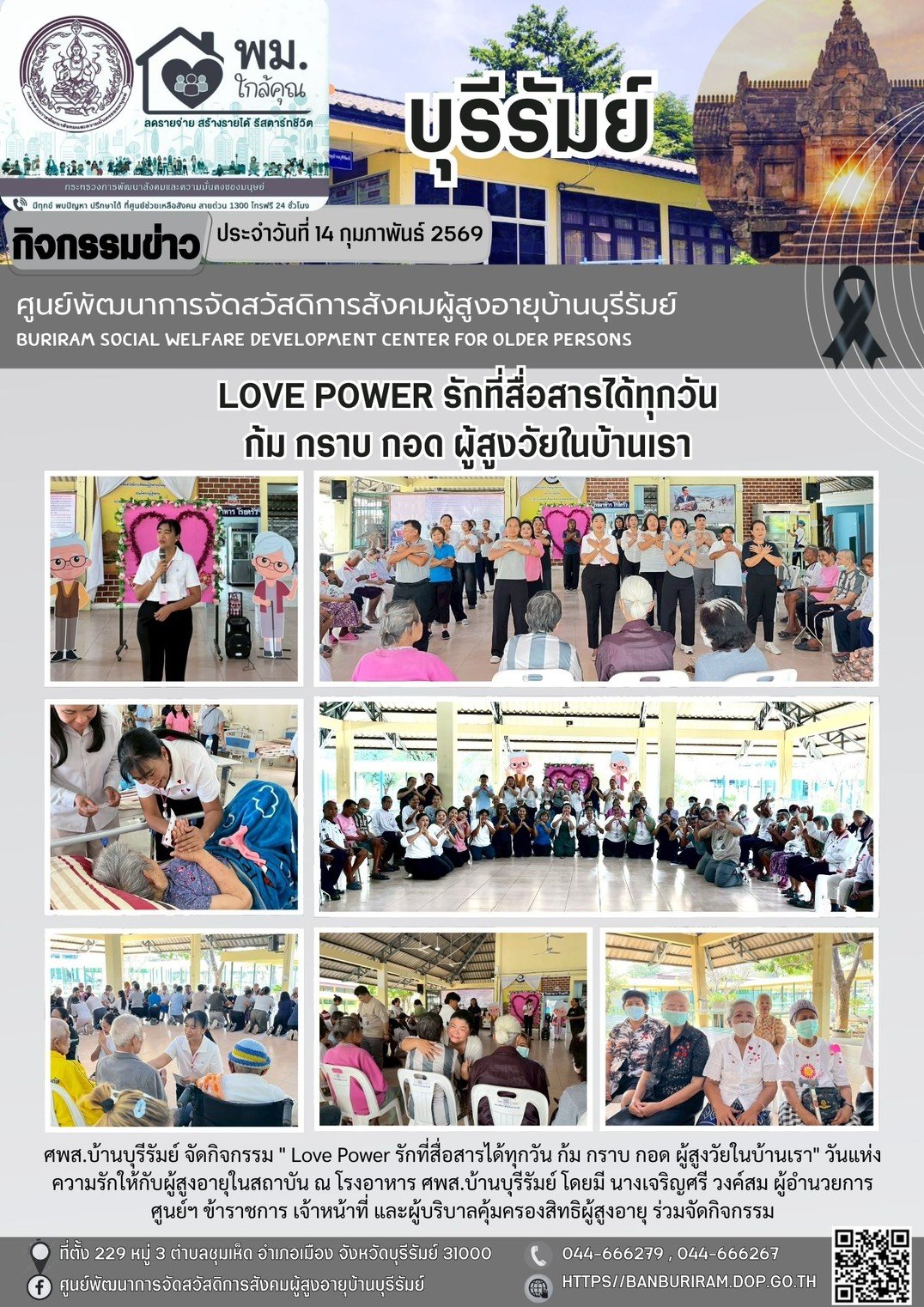 14 ก.พ. 2569 19ศพส.บ้านบุรีรัมย จัดกิจกรรม" รักที่สื่อสารได้ทุกวันด้วย ก้ม กราบ กอด ผู้สูงวัยในบ้านเรา" แสดงความรักแด่ท่านผู้สูงอายุในความดูแลของกรมกิจการผู้สูงอายุ ให้ผู้สูงอายุได้รับความรัก ความอบอุ่น และ ความเคารพ เปรียบดั่งได้รับการดูแลจากบุตรหลาน ณ บริเวณโรงอาหาร ศพส.บ้านบุรีรัมย์