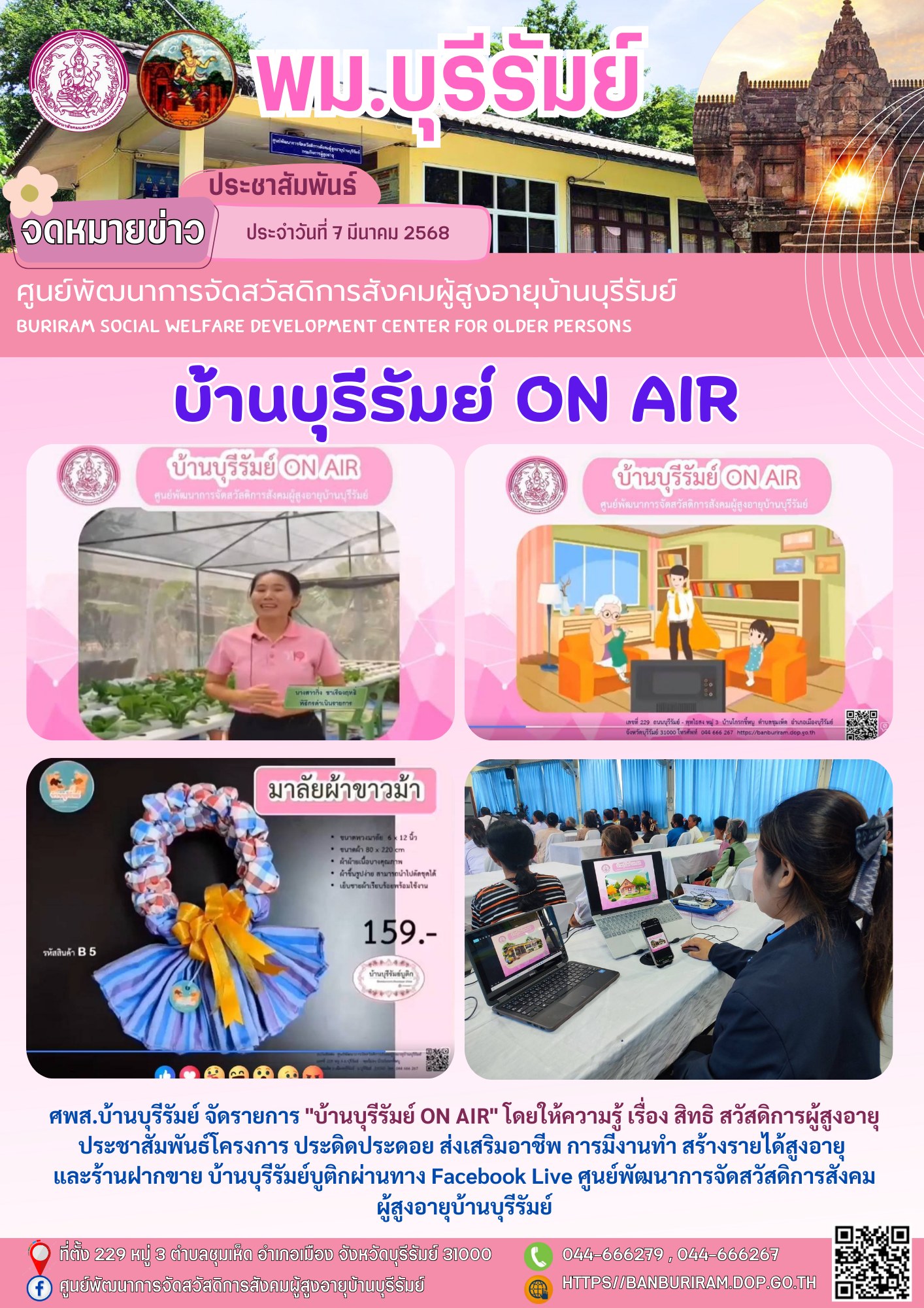 7 มี.ค. 2568 916ศพส.บ้านบุรีรัมย์ จัดรายการ "บ้านบุรีรัมย์ ON AIR" โดยให้ความรู้ เรื่อง สิทธิ สวัสดิการผู้สูงอายุ ประชาสัมพันธ์โครงการ ประดิดประดอย ส่งเสริมอาชีพ การมีงานทำ สร้างรายได้สูงอายุ และร้านฝากขาย บ้านบุรีรัมย์บูติกผ่านทาง Facebook Live ศูนย์พัฒนาการจัดสวัสดิการสังคมผู้สูงอายุบ้านบุรีรัมย์