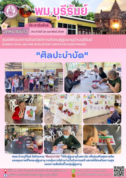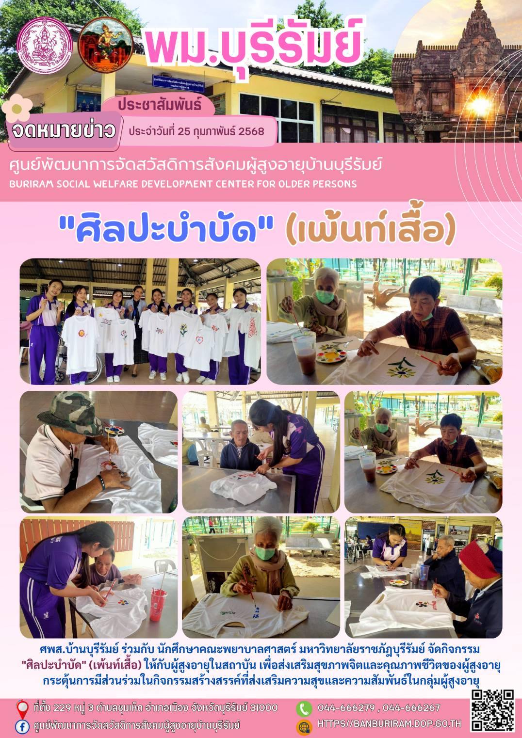25 ก.พ. 2568 548ศพส.บ้านบุรีรัมย์ ร่วมกับ นักศึกษาคณะพยาบาลศาสตร์ มหาวิทยาลัยราชภัฎบุรีรัมย์ จัดกิจกรรม "ศิลปะบำบัด" (เพ้นท์เสื้อ) ให้กับผู้สูงอายุในสถาบัน เพื่อส่งเสริมสุขภาพจิตและคุณภาพชีวิตของผู้สูงอายุ กระตุ้นการมีส่วนร่วมในกิจกรรมสร้างสรรค์ที่ส่งเสริมความสุขและความสัมพันธ์ในกลุ่มผู้สูงอายุ